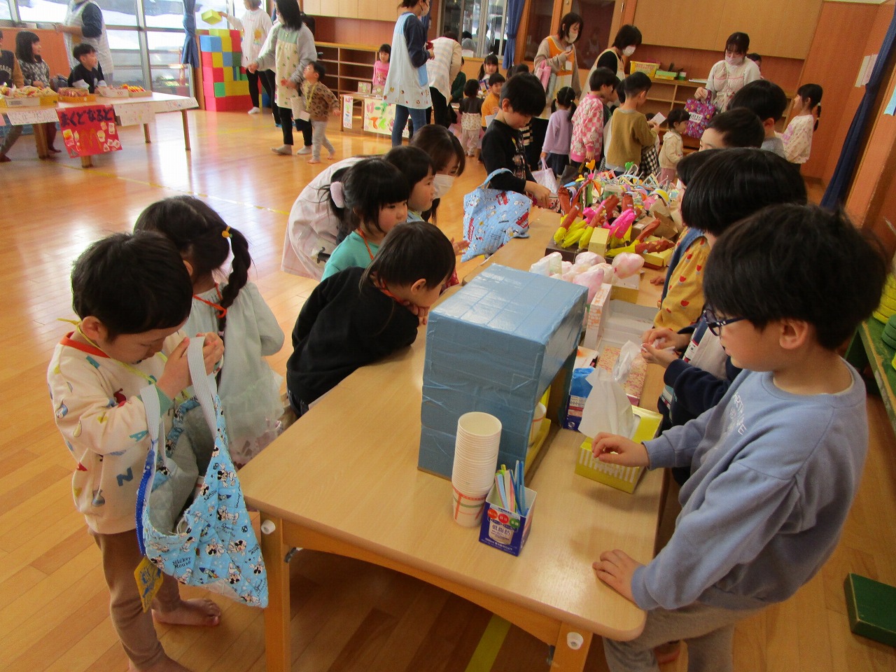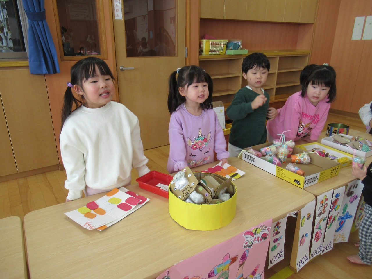 店員さん側に立つのは初めてだった今年は、準備から本番までたくさんの出来事がありました。様々なアイデアを出し合い、製作が進められていく中で、意見のぶつかり合いもあり、一度中断しのんびり休憩する日も!しかし、物事にお友だちと一緒に取り組む楽しさや日に日に商品が増えていく嬉しさを感じている子どもたちでした。うまくいった経験だけでなく、うまくいかなかった経験も、今後の成長の糧にしていきたいと思います!