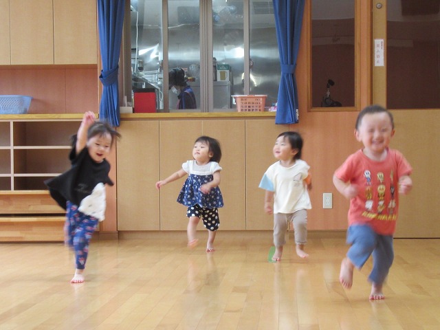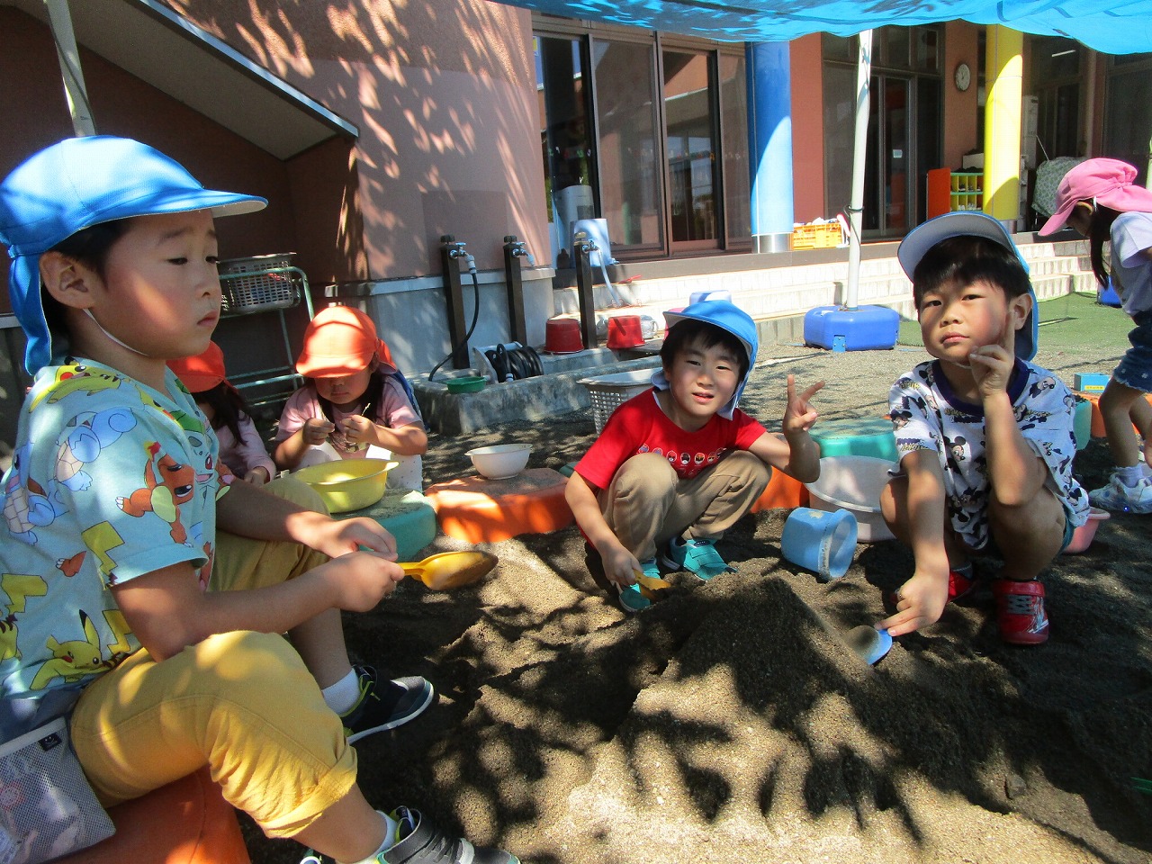 暑い日が続きましたが、水、プールあそびをしたり、かき氷を食べたりと夏を満喫しました。水がかかるのが苦手だった子も友だちの刺激を受け、水に顔をつけられるようになったり、潜れるようになったり、バタ足ができるようになったことで自信につながっています。9月も運動会に向けた活動に取り組みながら、楽しく元気に過ごしたいと思います。