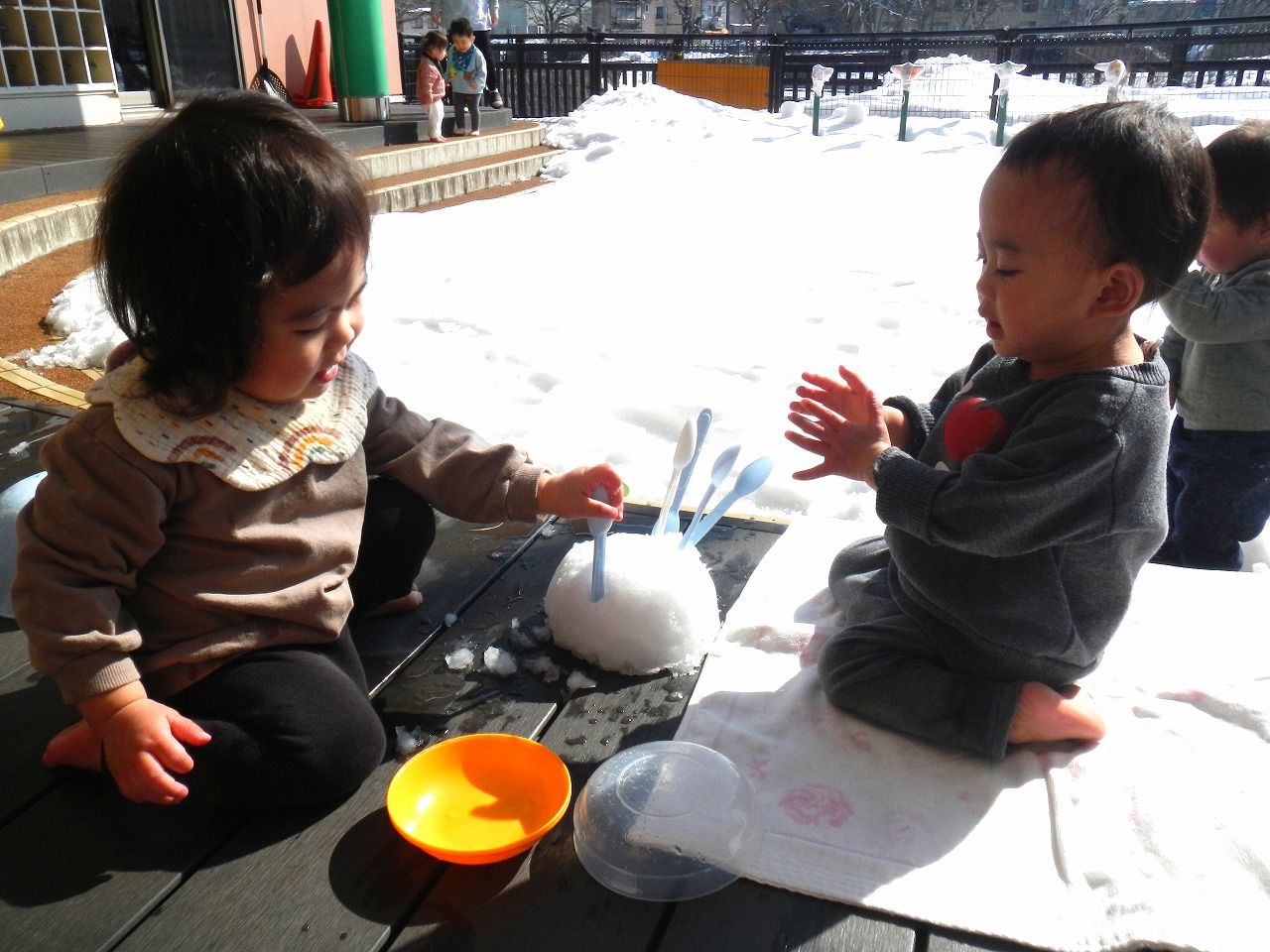 雪にそっと触れて不思議そうな表情を見せる子、豪快につかんで投げる子、ぎゅっと握って感触を確かめる子…。ひよこ組さんも、お部屋やテラスで“プチ雪あそび”を楽しみました♪また、最近はできることが増え、簡単な身のまわりのことにも自分から取り組もうとする姿が見られるようになってきました。一人一人の意欲を大切にしながら温かく見守っています☻