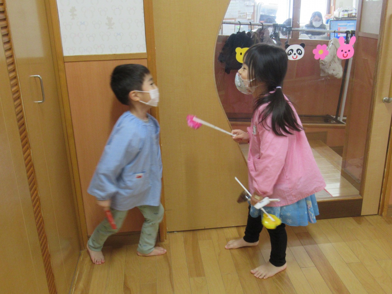 おゆうぎ会を終え、少しのんびり過ごしている子どもたちです。おゆうぎ会の練習が始まった頃から、みんなが意欲的に活動に参加し、楽しむ姿が見られました。また、初めての劇あそびでしたが、絵本を見てあそびから始めたことで、一人一人がセリフや動きを覚え、徐々に形になっていき、子どもたちの成長を感じました。おゆうぎ会は全員での参加とはなりませんでしたが、この経験は子どもたちにとって自信につながったと思うので、今後にも活かしていきたいと思います。