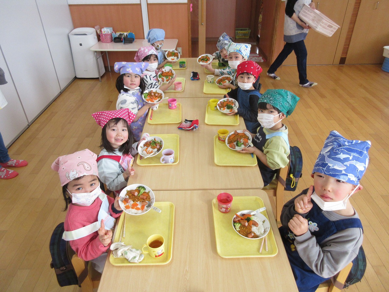 おゆうぎ会の練習では、恥ずかしそうにしていた子どもたちも、練習を重ねることで自信がもてるようになり、本番では練習以上に堂々とした歌声や踊りを見せてくれて成長を感じました。自信をつけ、パワーアップした子どもたちが寒さに負けず元気に過ごせるようにしていきたいと思います。