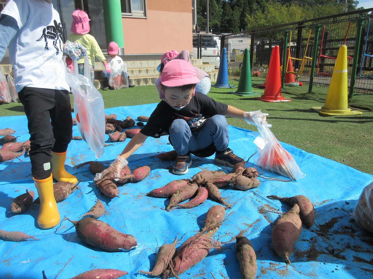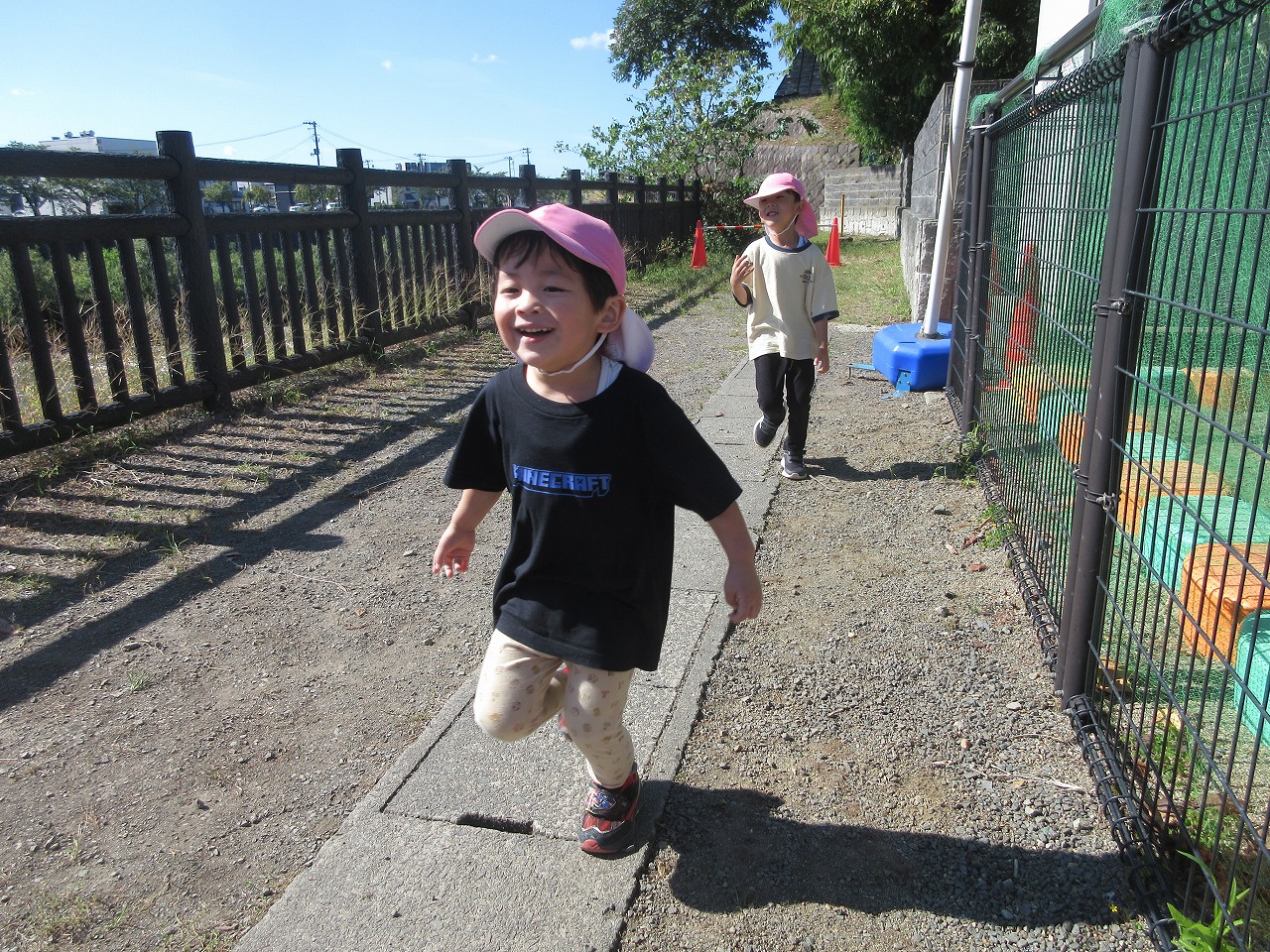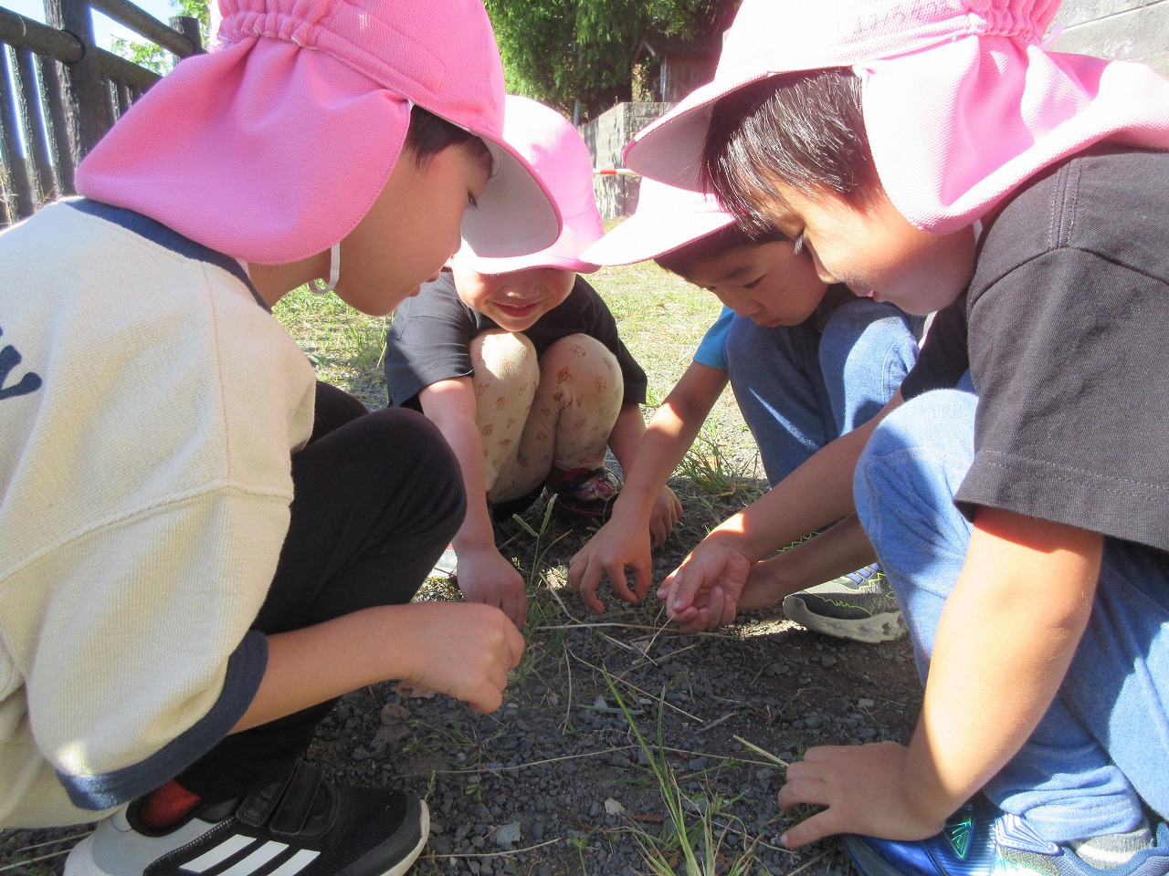 肌寒く感じられる日も増えてきていますが、子どもたちは、まだまだ汗だくになりながら遊んでいます。戸外に出ると、コオロギやトンボなど秋の虫に夢中になる子や、落ち葉を使ってままごとをする子など一人一人が秋の自然に触れて楽しんでいます。運動会に向けた活動が始まり毎日意欲的に取り組んでおり、時にはうさぎ組のお友だちを手伝う姿に成長を感じています。これから運動会にお散歩遠足、いもほりと行事が盛りだくさんなので体調に気をつけて過ごしていきたいと思います。
