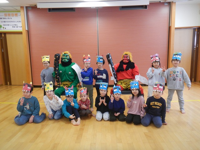 今日は節分で、朝から少し緊張気味の子どもたちでした。くま組さんは、自分の心の中の悪い鬼を発表して、無事に鬼を退治することができました。鬼の顔クッキングでは、くま組、ぱんだ組は包丁を使い具材をカットして鬼の顔を作りました。うさぎ組、こねこ組もカットされた具材を自分で好きなようにトッピングをして楽しみました♪