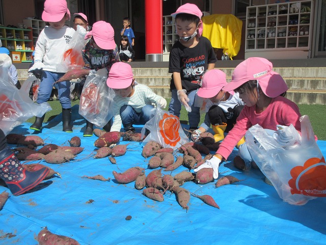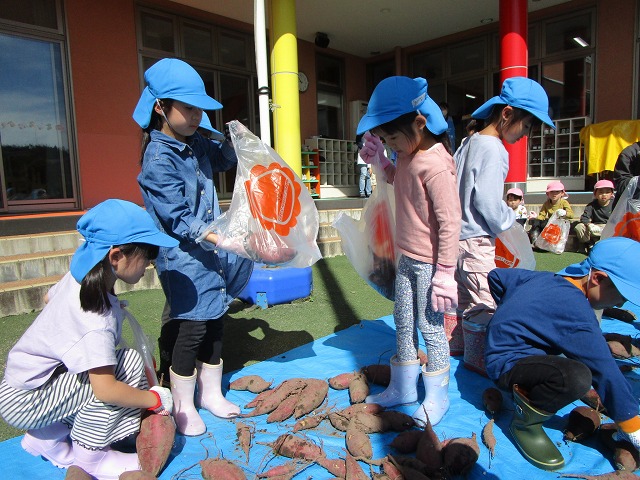 今日はいもほりでしたが、熊対策で残念ながらいもほりは中止となってしまいました。職員の掘ってきたおいもを、ぱんだ組さんとくま組さんが仕分けをしてくれました。いろいろな大きさのさつまいもに触れ、喜んでいました!お家でのさつまいも料理楽しみだなあ!!午後のおやつはふかしいも!おいしかったです☆