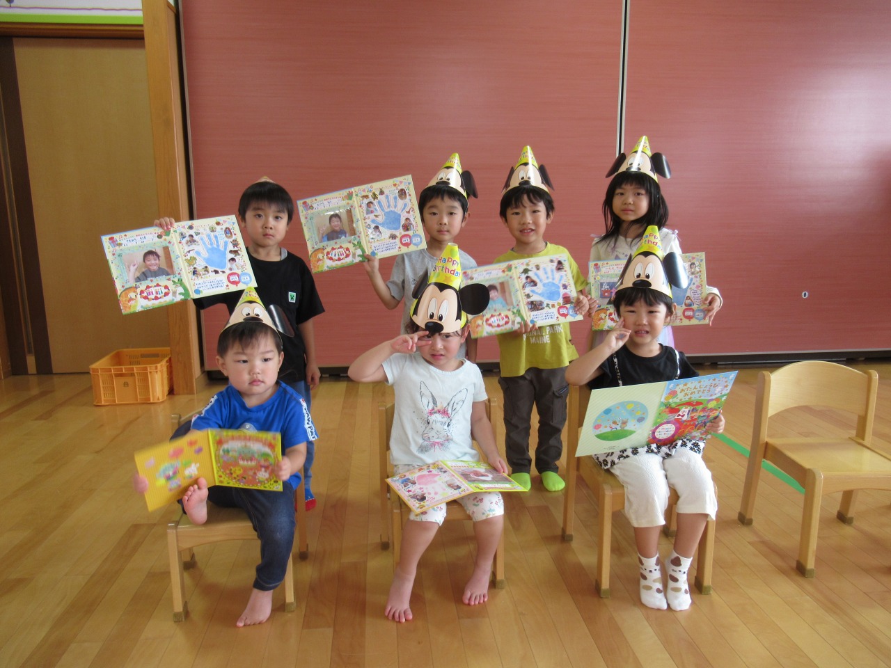 7月の誕生会がありました。少し緊張した様子でしたが、がんばってインタビューに答えていました。出し物は「かみなりどんがやってきた」の手遊びや、「食いしん坊のゴリラ」のエプロンシアター、「ねないこだれだ」のお話など、盛りだくさんでした!7月生まれのみなさん、おめでとうございます☆彡
