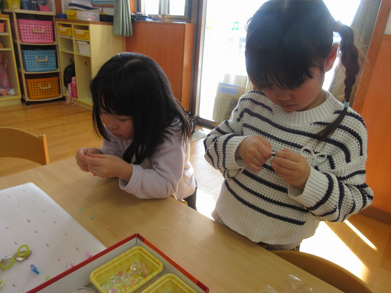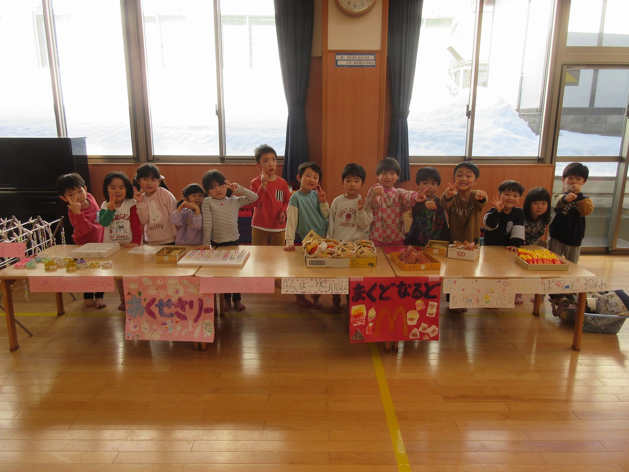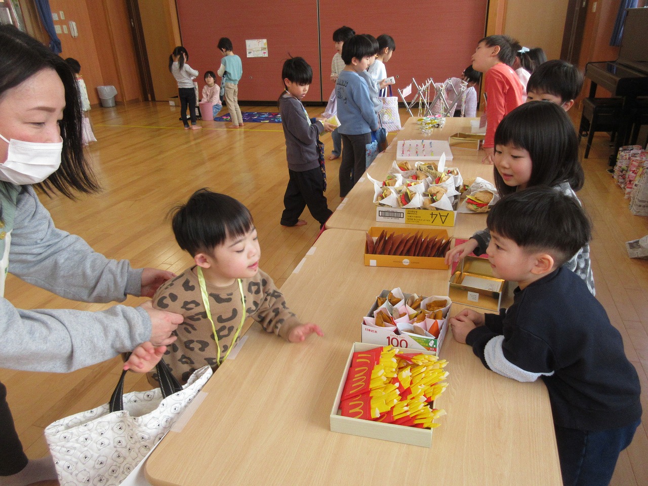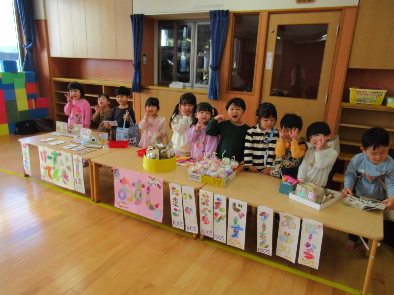 子どもたちが楽しみにしていたお店屋さんごっこは大盛況でした☻準備期間中も、年下の友だちを思い浮かべながら丁寧に作ろうとする姿や、友だちと意見を出し合いながら作る姿が多く見られ成長を感じました。今年度も残りわずかにはなりましたが、進級に期待をもって過ごせるようにしていきたいと思います。
