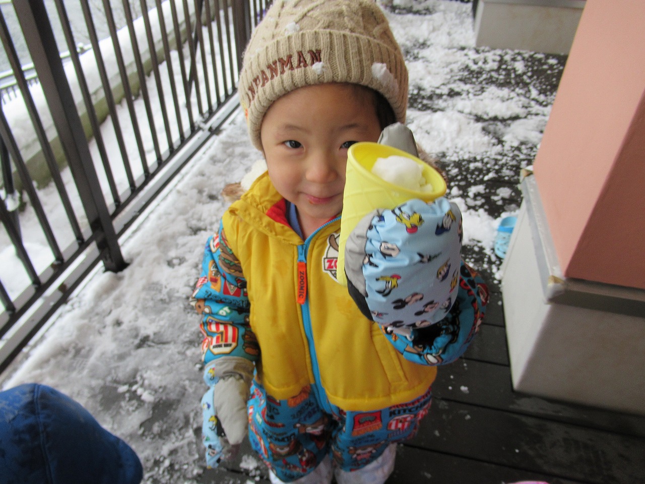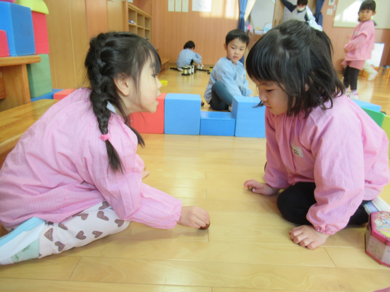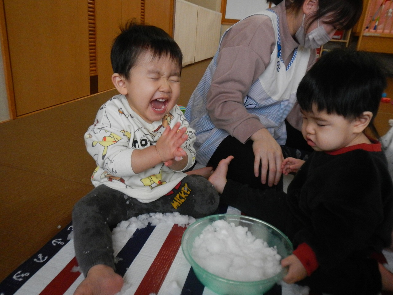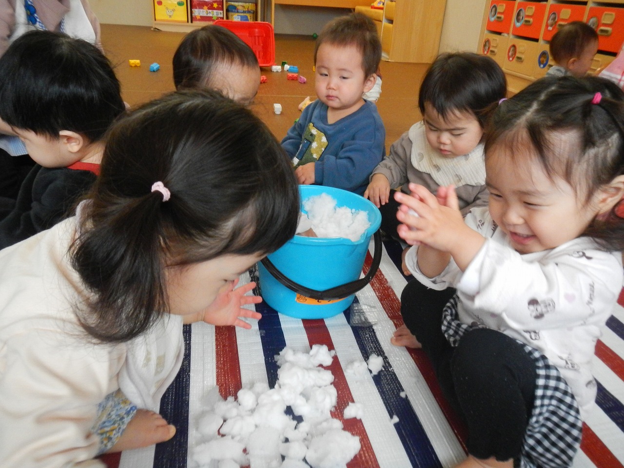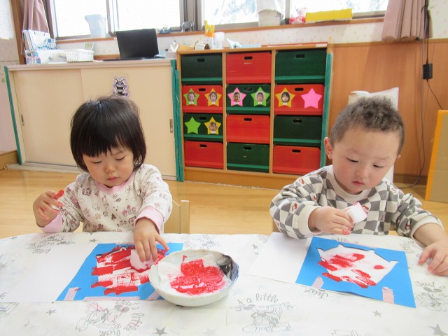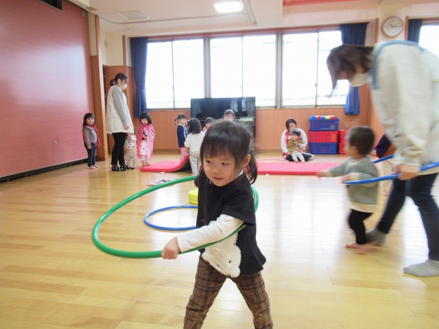 雪が降り、寒さも厳しくなってきましたが、窓を指差し「寒いね」と話しながらも「先生!雪!」と嬉しそうに話す子どもたちです(^^♪あそびや生活のなかで友だちや保育者とのやりとりを楽しんでいて、「○○ちゃん一緒に行こう」と、友だちの所まで迎えに行く優しい姿も見られました。あそびのなかでも「どうしたの?」と頭を撫でてあげ、友だちを思いやる優しさに心が温かくなりました(*^^*)来年も子どもたちと笑顔あふれる楽しい毎日を過ごしていきたいです!