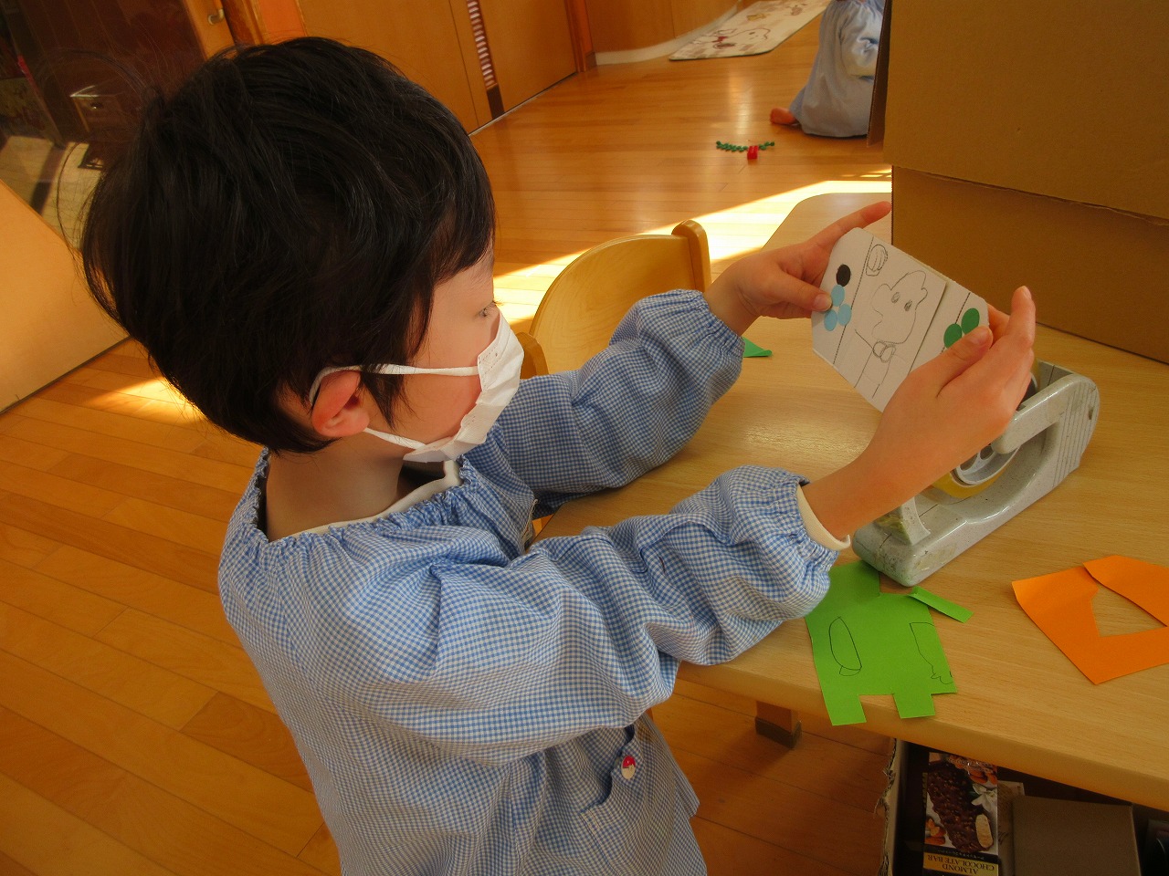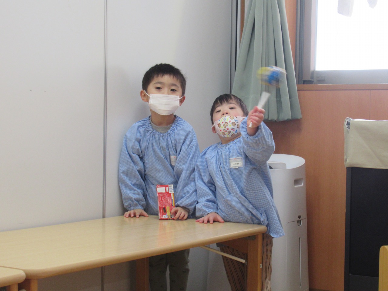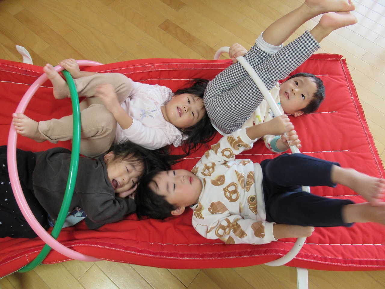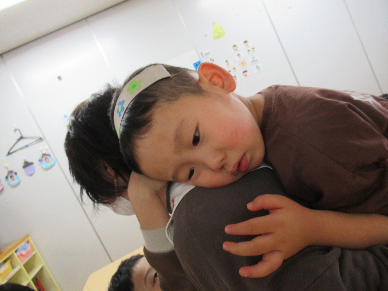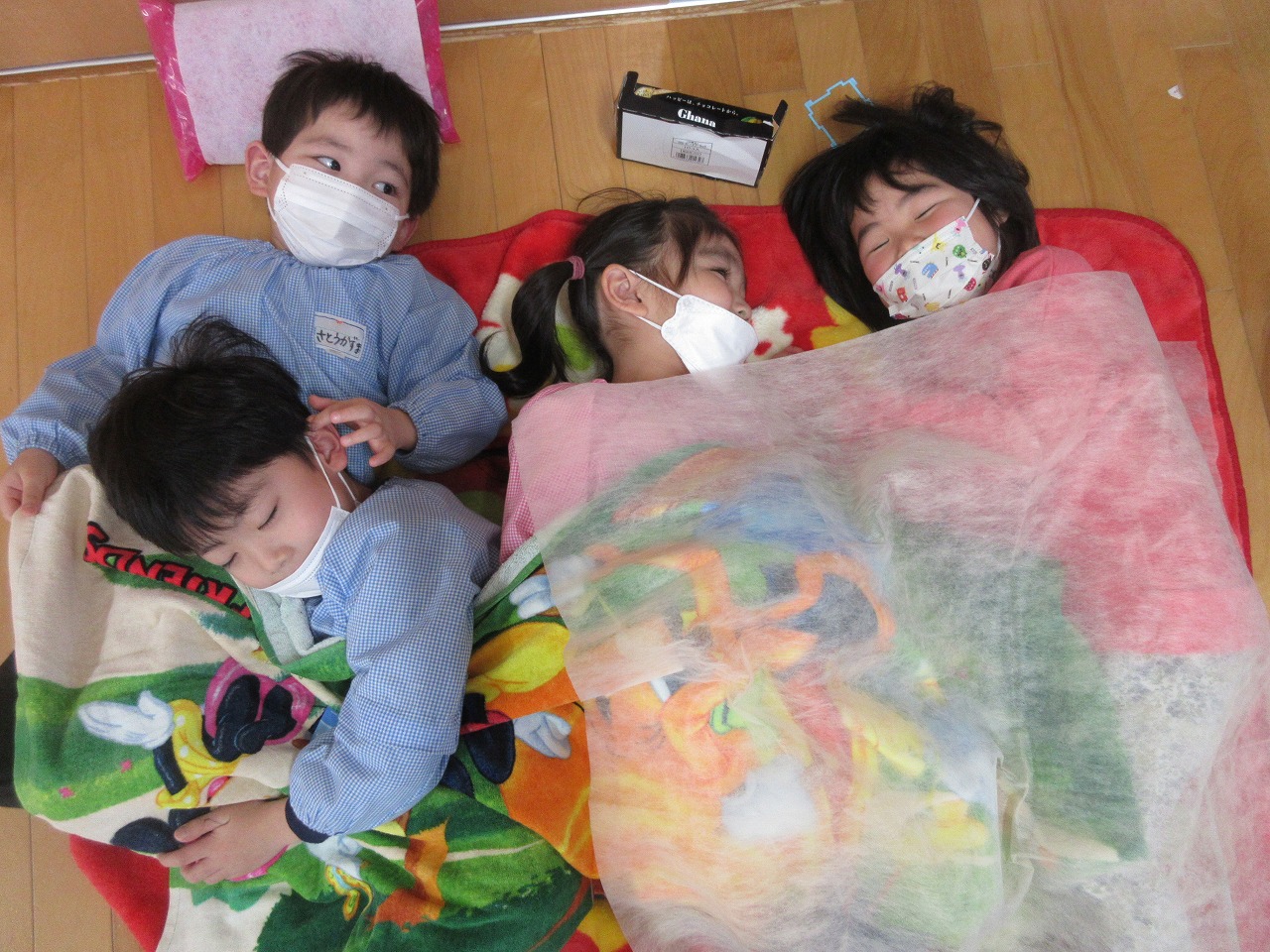 おゆうぎ会を終え、少しのんびり過ごしている子どもたちです。おゆうぎ会の練習が始まった頃から、みんなが意欲的に活動に参加し、楽しむ姿が見られました。また、初めての劇あそびでしたが、絵本を見てあそびから始めたことで、一人一人がセリフや動きを覚え、徐々に形になっていき、子どもたちの成長を感じました。おゆうぎ会は全員での参加とはなりませんでしたが、この経験は子どもたちにとって自信につながったと思うので、今後にも活かしていきたいと思います。