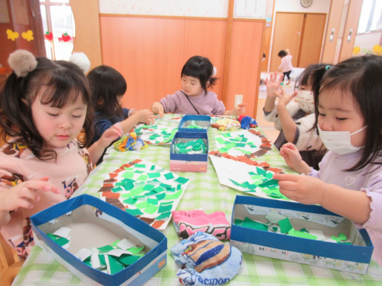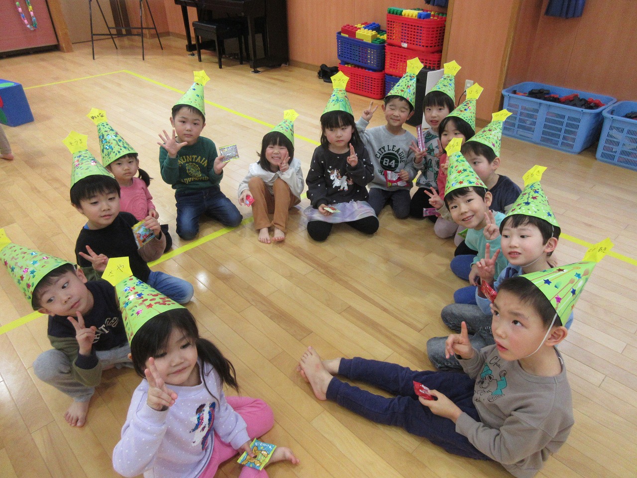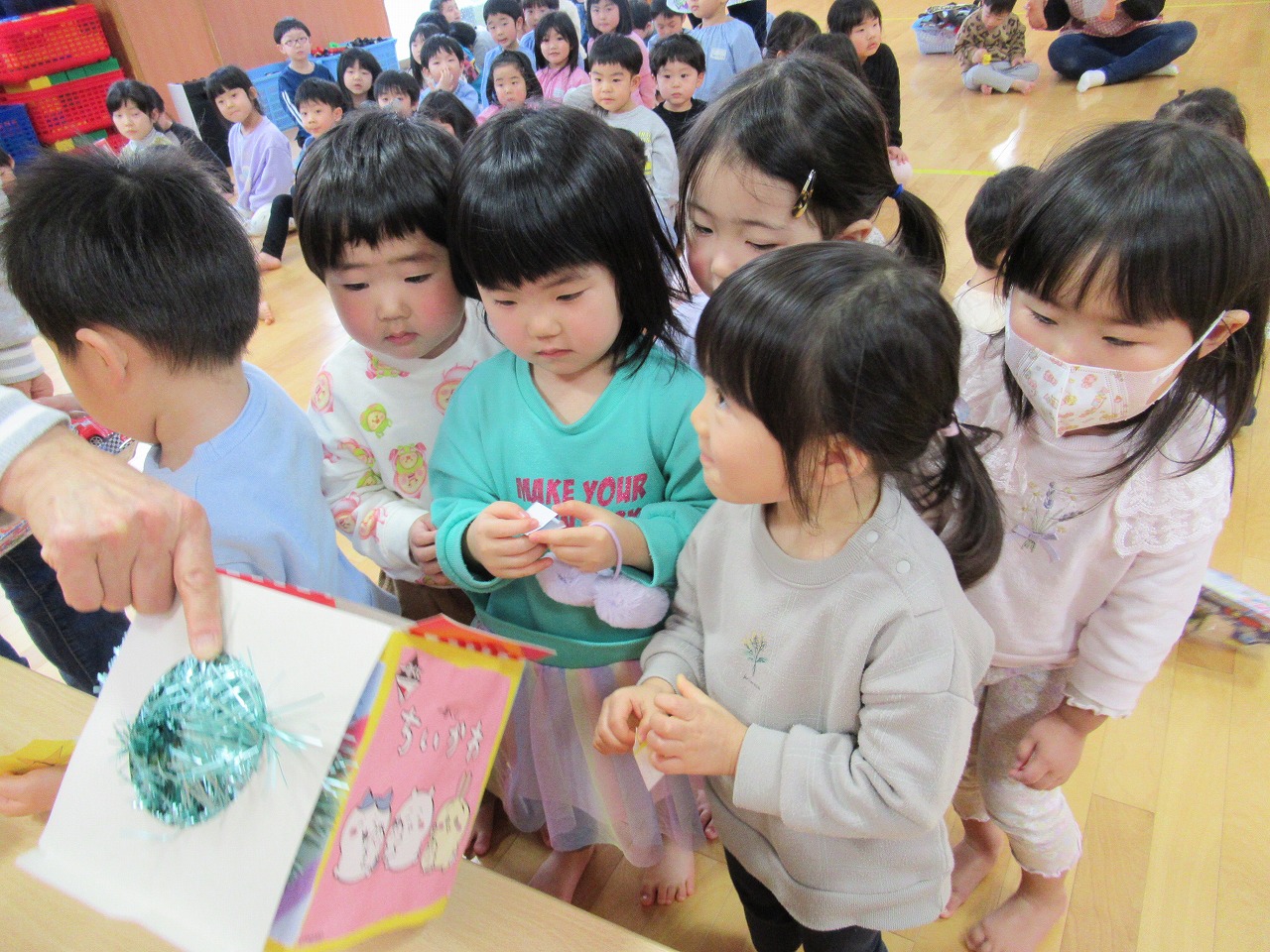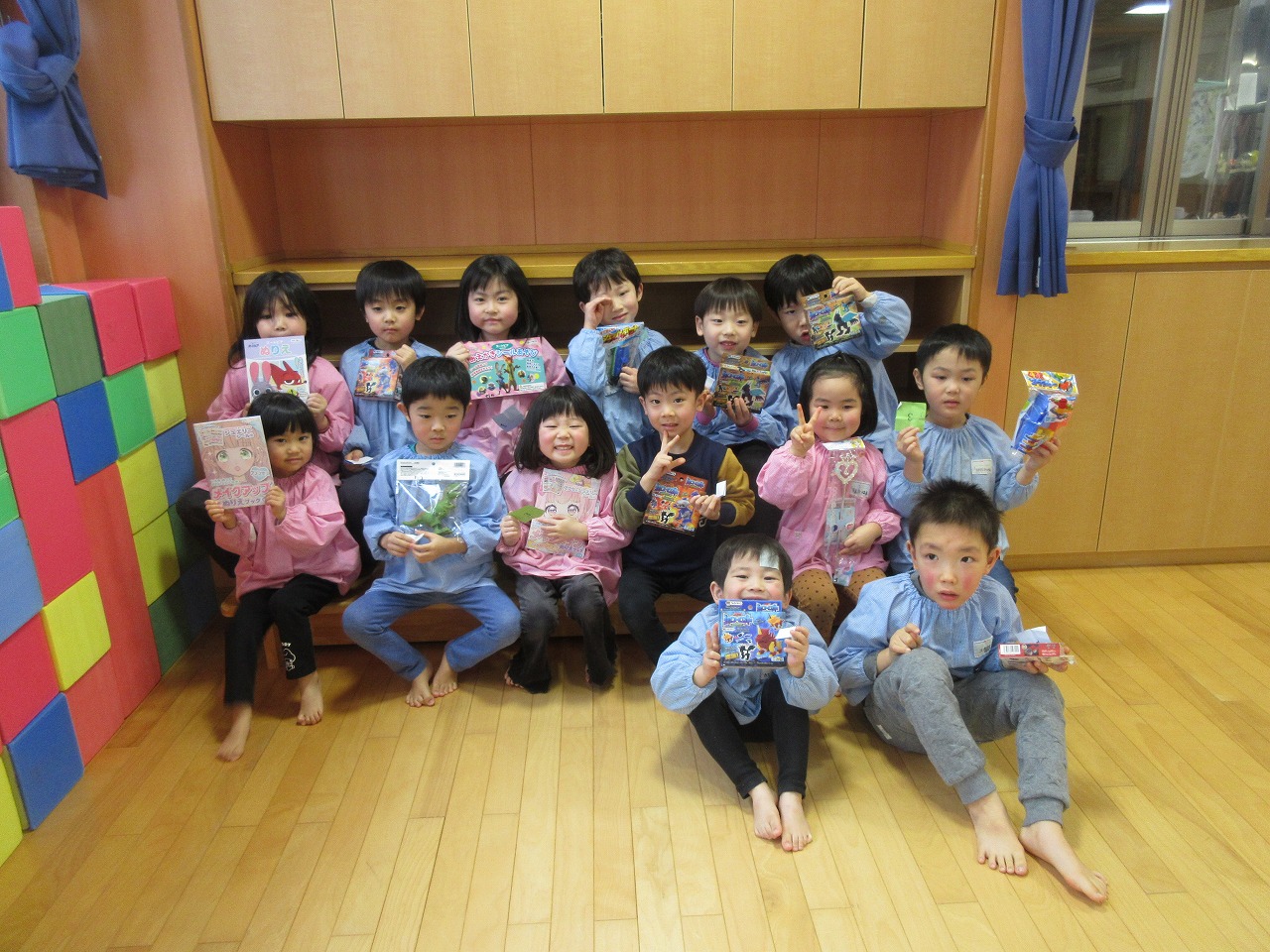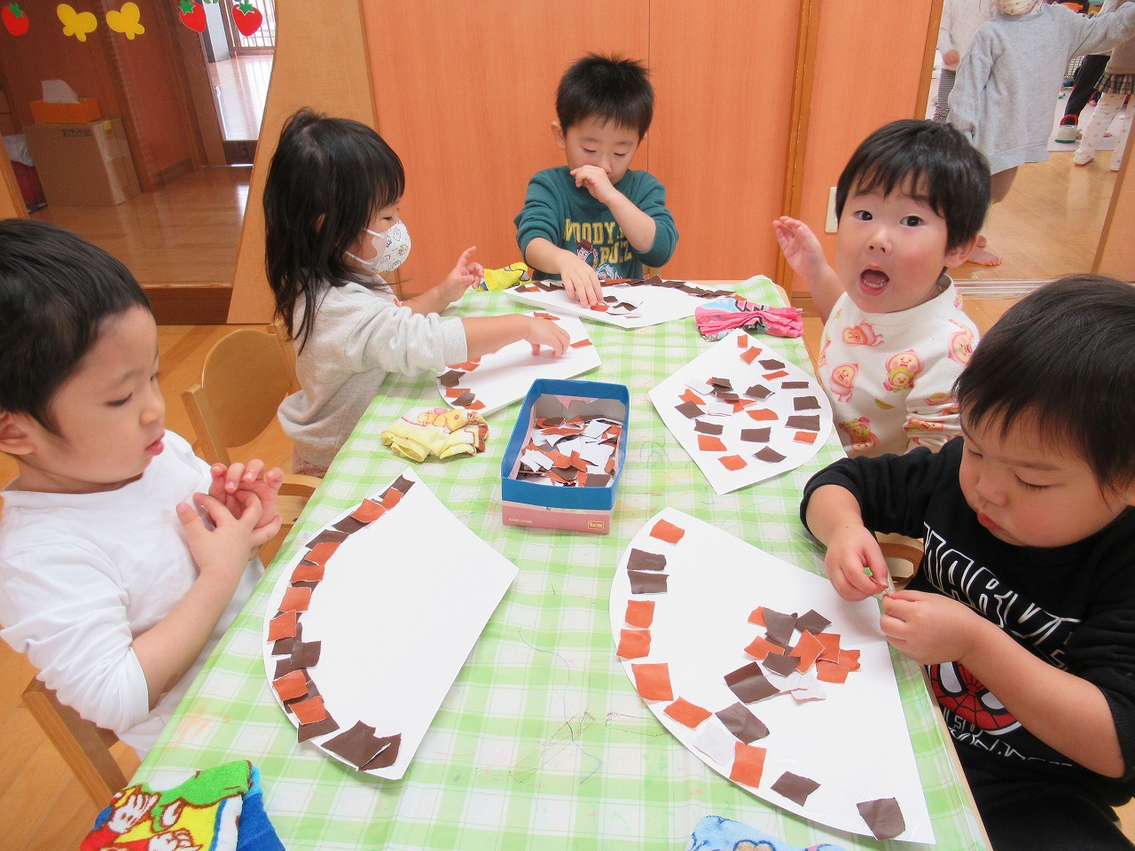 おゆうぎ会を終え、少しのんびり過ごしている子どもたちです。おゆうぎ会の練習が始まった頃から、みんなが意欲的に活動に参加し、楽しむ姿が見られました。また、初めての劇あそびでしたが、絵本を見てあそびから始めたことで、一人一人がセリフや動きを覚え、徐々に形になっていき、子どもたちの成長を感じました。おゆうぎ会は全員での参加とはなりませんでしたが、この経験は子どもたちにとって自信につながったと思うので、今後にも活かしていきたいと思います。