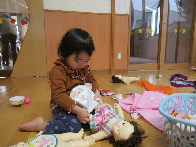 生活の流れを覚え、迷わずに次のことに取り組めるようになってきました。自分でトイレに行ったり着替えたり畳んだり、箸をつかって給食を食べたり、一人でできることが増えてきています。年末はゆっくりと過ごしパワーを蓄え、年明けは笑顔で元気いっぱいで登園し、楽しいお正月の出来事を、お話してくれることを楽しみにしています。
