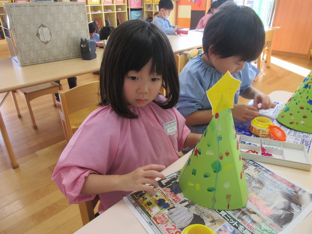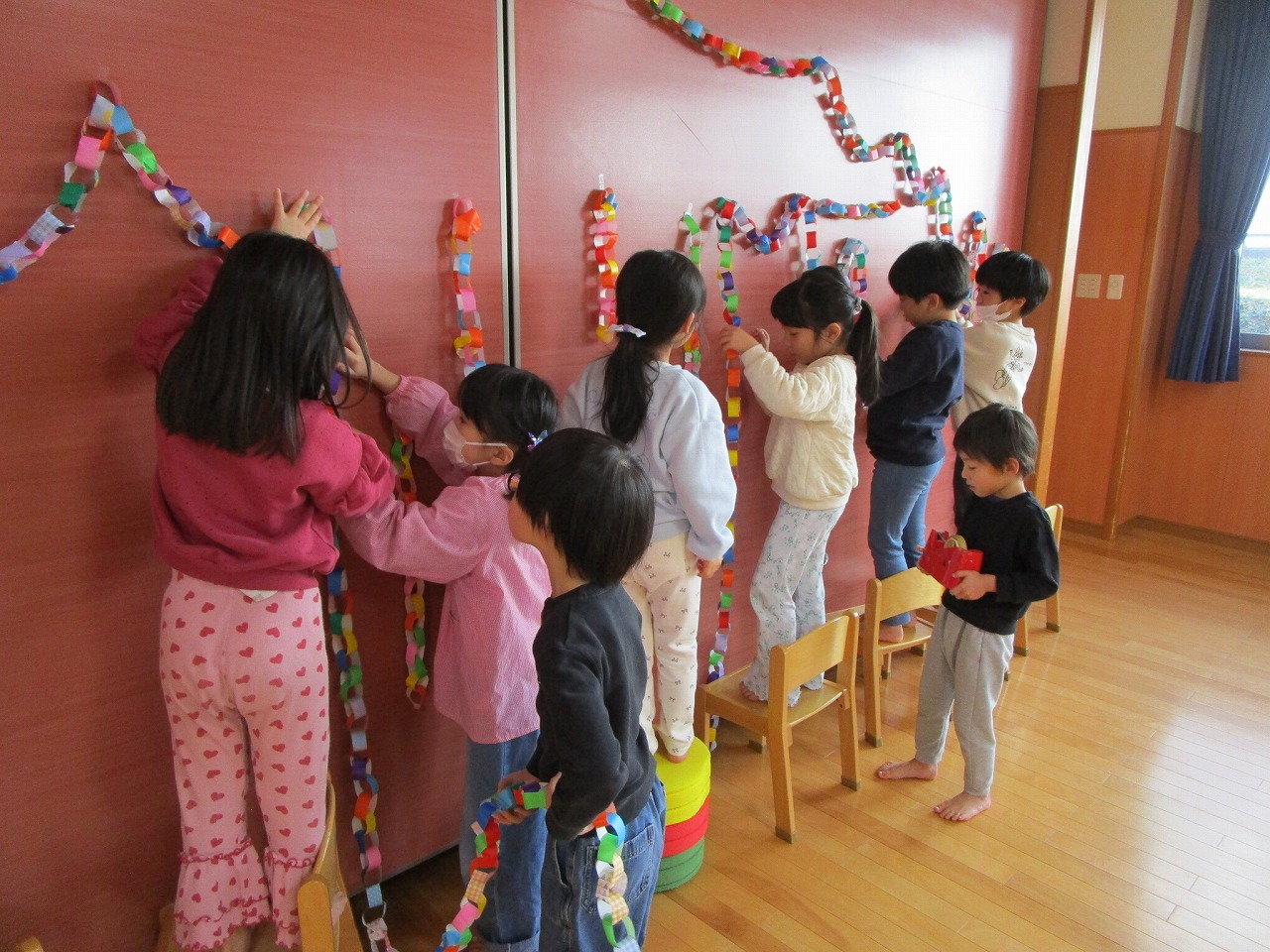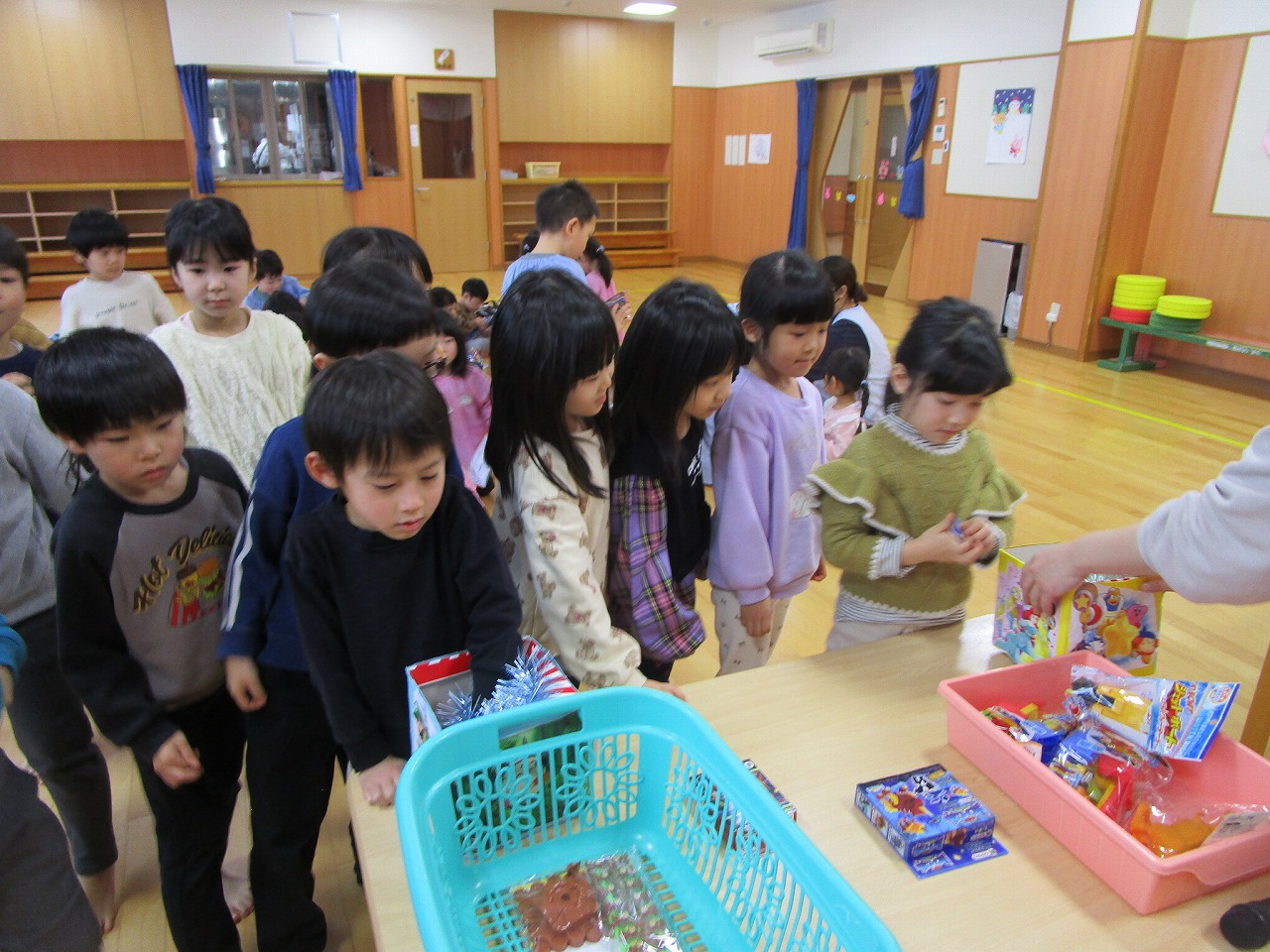 クリスマス会に向け、フォークダンスや司会、飾りつけの準備など、年下児のお友だちが喜んでくれることを願いながら、準備を頑張りました。雪が降らないので「サンタさん来てくれるかな」と心配していましたが、クリスマス会当日はたくさんのプレゼントを持ってきてくれ楽しいクリスマス会となりました。1月はお正月のあそびを楽しみたいと思います。