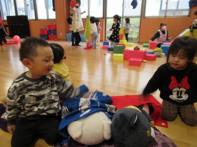 先日のおゆうぎ会、ありがとうございました。本番のステージでは緊張した様子の子どもたちでしたが、おゆうぎ会の余韻が今も抜けないようで、「ピカブー!」を踊ったり歌を口ずさんだりしながら楽しんでいます♪これから寒さも厳しくなってきますが、元気いっぱいに過ごしていきたいと思います!(^^)!