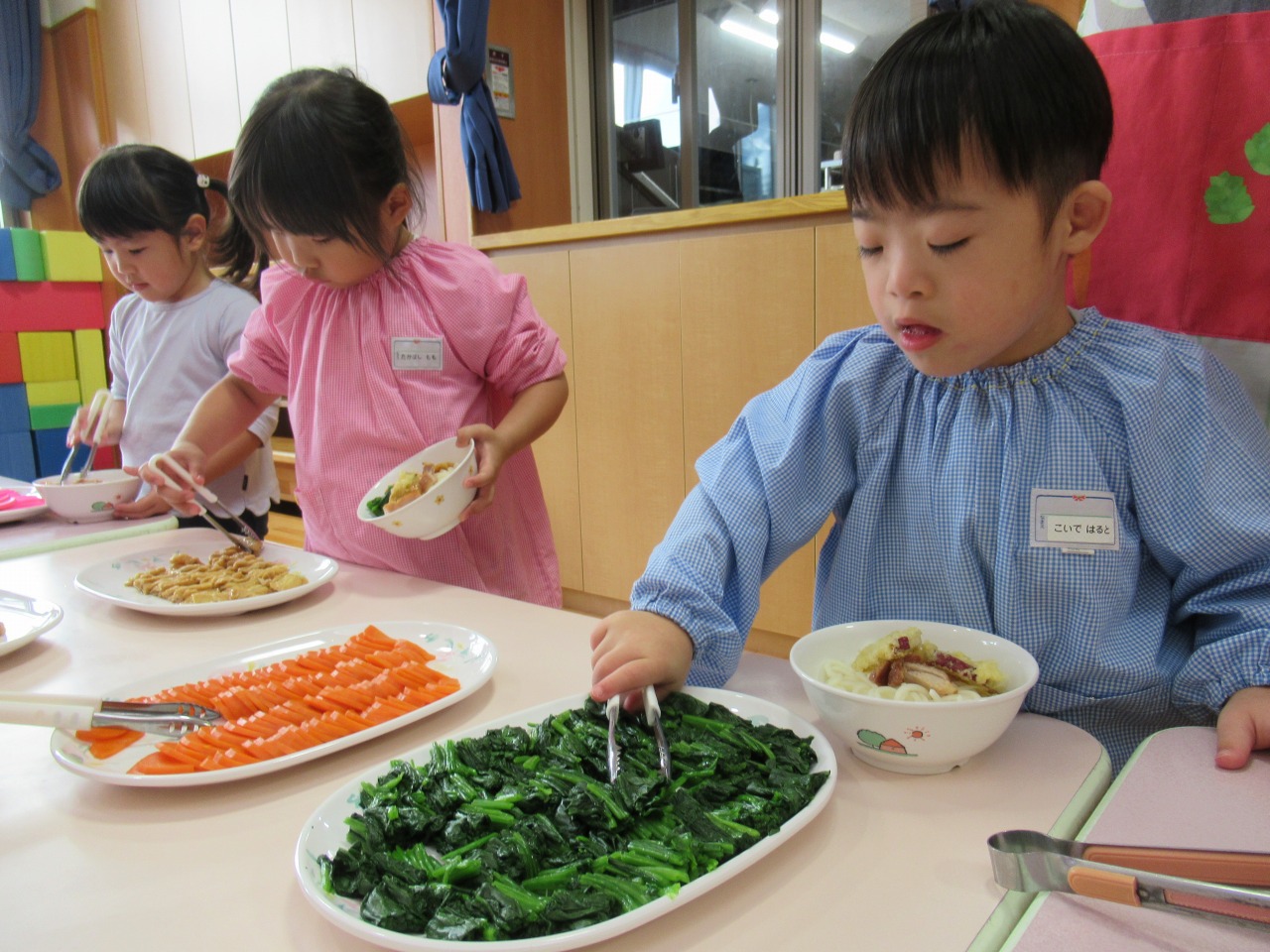 肌寒く感じられる日も増えてきていますが、子どもたちは、まだまだ汗だくになりながら遊んでいます。戸外に出ると、コオロギやトンボなど秋の虫に夢中になる子や、落ち葉を使ってままごとをする子など一人一人が秋の自然に触れて楽しんでいます。運動会に向けた活動が始まり毎日意欲的に取り組んでおり、時にはうさぎ組のお友だちを手伝う姿に成長を感じています。これから運動会にお散歩遠足、いもほりと行事が盛りだくさんなので体調に気をつけて過ごしていきたいと思います。